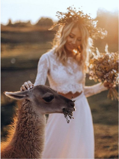 Two Piece Crew Long Sleeves White Chiffon Boho Wedding Dresses with Lace OKK43