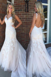 V Neck Backless Mermaid Lace Appliques Long Wedding Dresses with Train OK1727