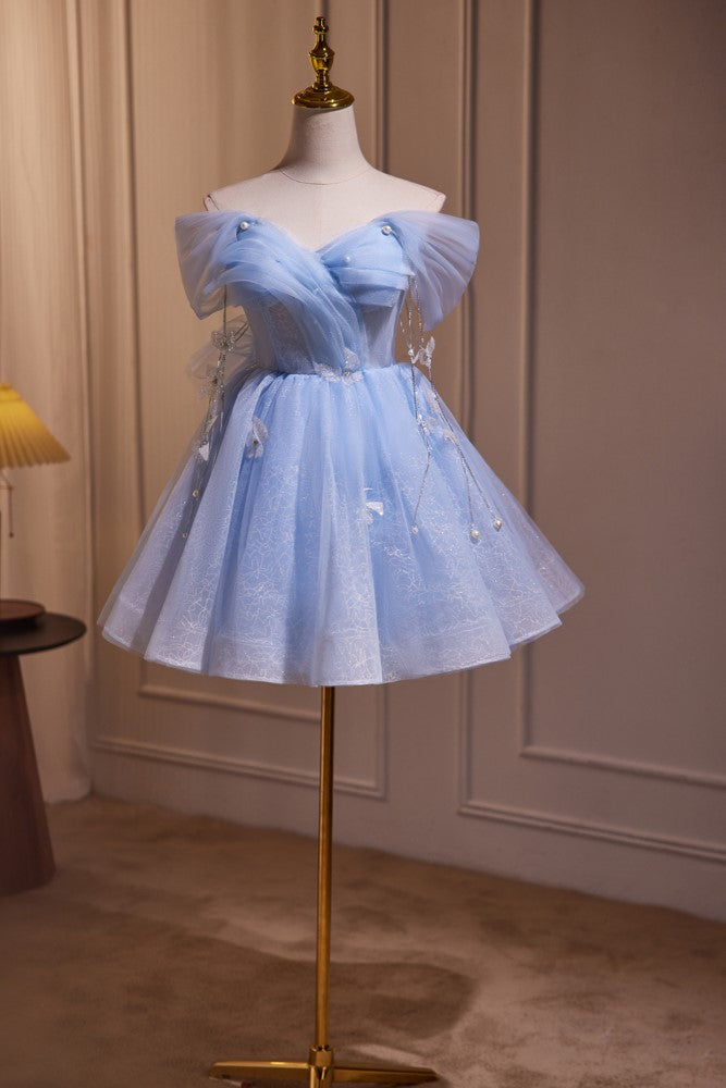 Elevate your style with our Blue Fairy Off the Shoulder Lace Short Homecoming Dresses. The intricate lace and off-shoulder design add a touch of elegance to this must-have dress. Perfect for any special occasion, this dress will make you stand out with its unique and stunning features.