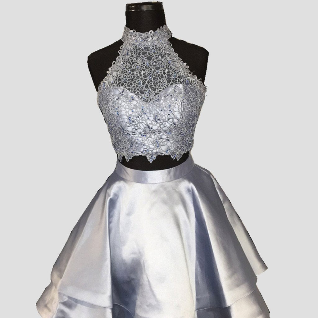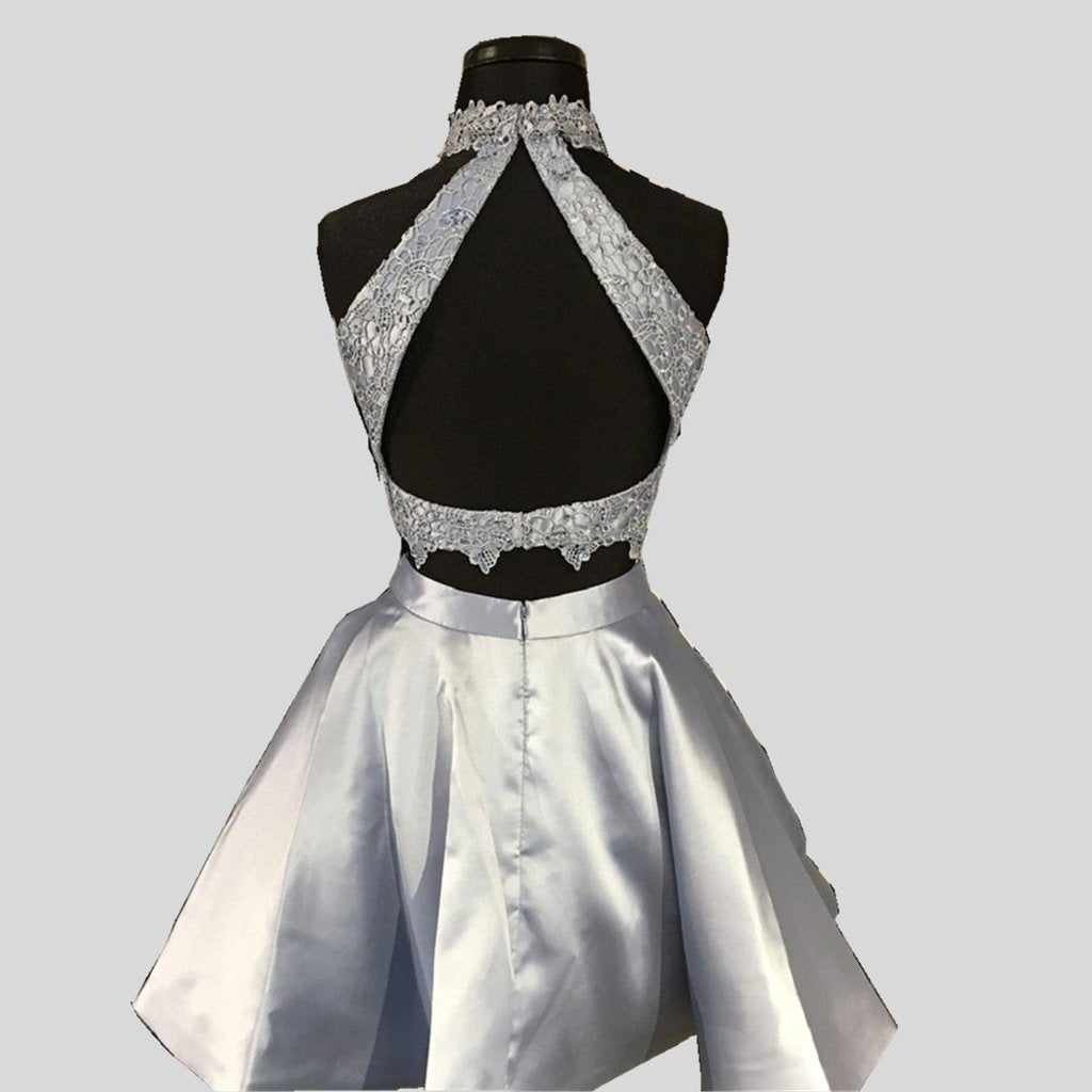 Blue Two Piece High Neck Lace Top Satin Open Back Sleeveless Homecoming Dress OK370