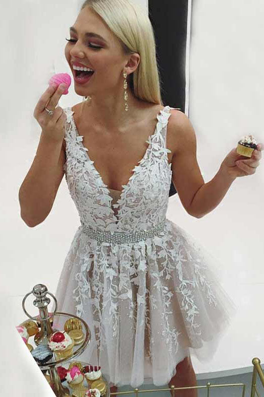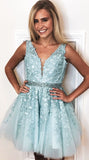Cheap A-Line V-Neck Short Homecoming Dresses with Beading Appliques OKO3
