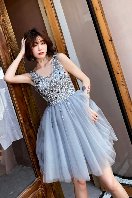 V Neck A Line Beaded Homecoming Dress, Short Tulle Prom Dress OKN59