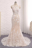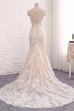 Unique Mermaid White Sleeveless Prom Dresses,Lace Long Sweep Train Wedding Dress OK636