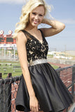 V-neck Black Lace Open Back Short Beading Homecoming Dress K59