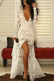 Fashion Mermaid Deep V-Neck Long Sleeves Split Front Ivory Lace Prom Dresses OK755
