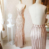 Mermaid Spaghetti Straps Rose Gold Long Simple Prom Dress with Sequins OKD75