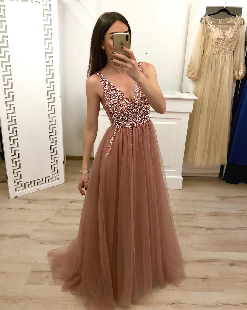 A Line V Neck Tulle Long Beaded Prom Dresses, Cheap Evening Gown OKH57