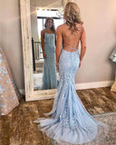 Blue Lace Applique Mermaid Sexy Charming Long Prom Dresses OKE39
