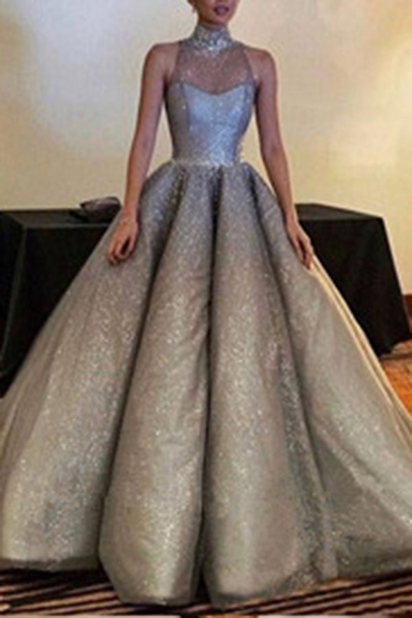 Sparkle High-Neck Long Prom Dress,Gorgeous Ball Gown OKE53