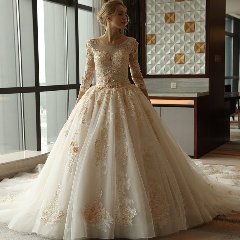 3/4 Sleeve Lace Appliques Tulle Ball Gowns Plus Size Wedding Dress OK639