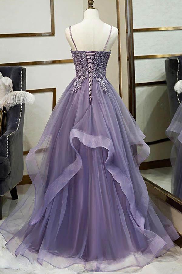 Charming Tulle A-line V-neck Spaghetti Straps Long Prom Dress With Lace Appliques OKX36