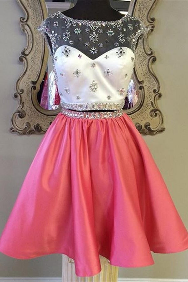 Red Satin Two Pieces Beaded Cute Girly Homecoming Dress K353