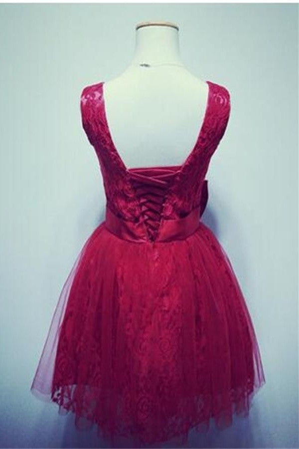 Red V-neck Lace Short Lace Up Open Back Homecoming Dress K159