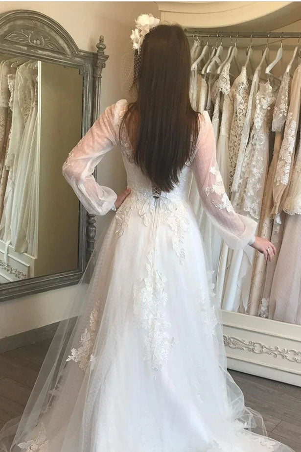 A-line V-Neck Lantern Sleeve Lace Appliques Wedding Lace Up Back Formal Bride Gowns OKV35