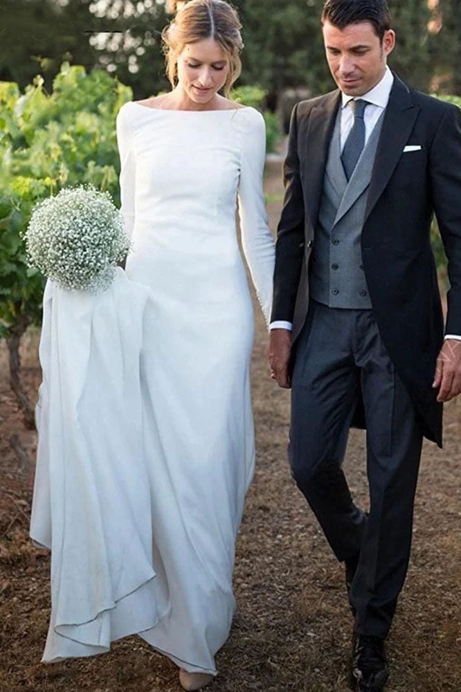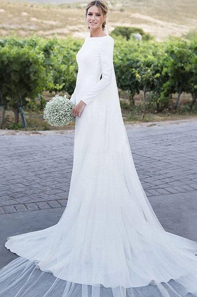 Sheath Long Sleeves Boat Neckline V Back Beach Country Wedding Gown OKW54