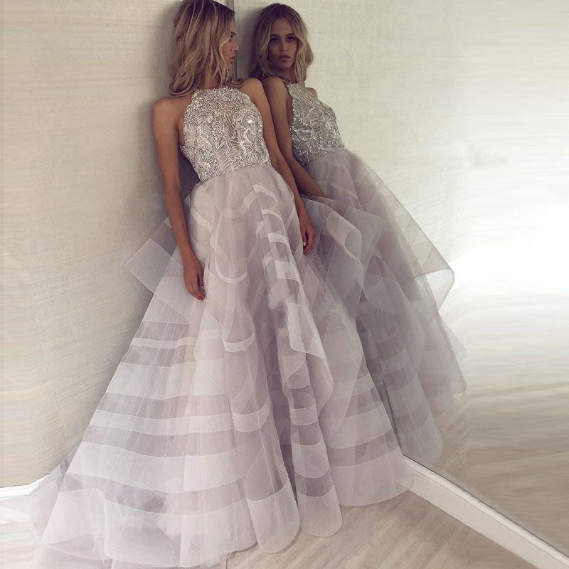 Fashion A-Line Crew Backless Lavender Organza Prom Dresses with Beading OKG20