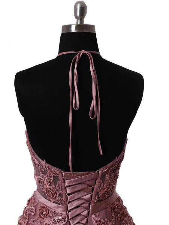 Halter Dusty Red Lace Appliques Tulle A line Long Prom Dress OKA86
