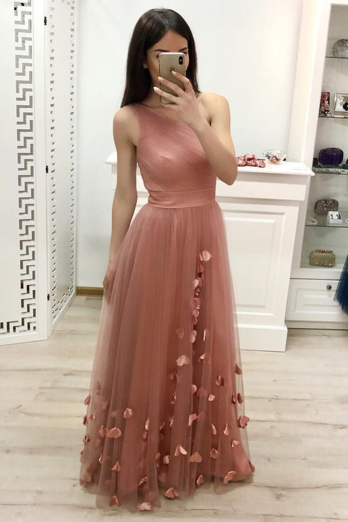 One Shoulder A Line Tulle Floor Length Prom Dress Cheap Long Evening Dress OKJ23