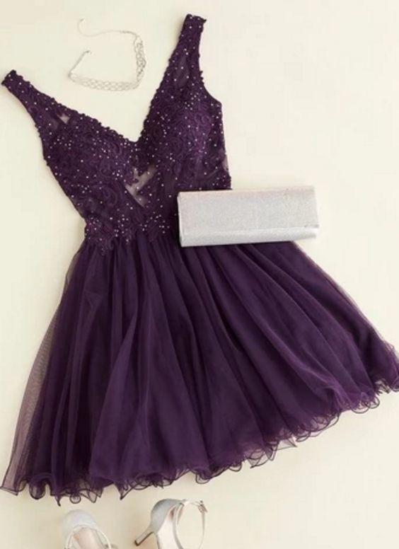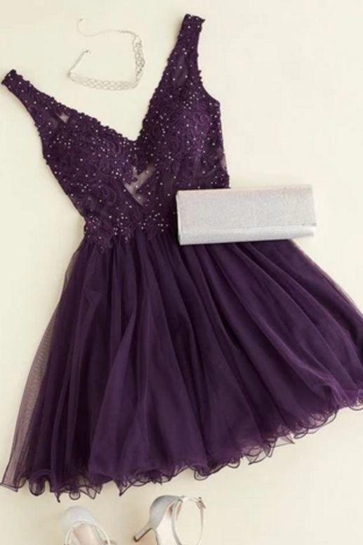 A-line V Neck Beaded Tulle Purple Short Homecoming Dress Graduation Dress OKX99