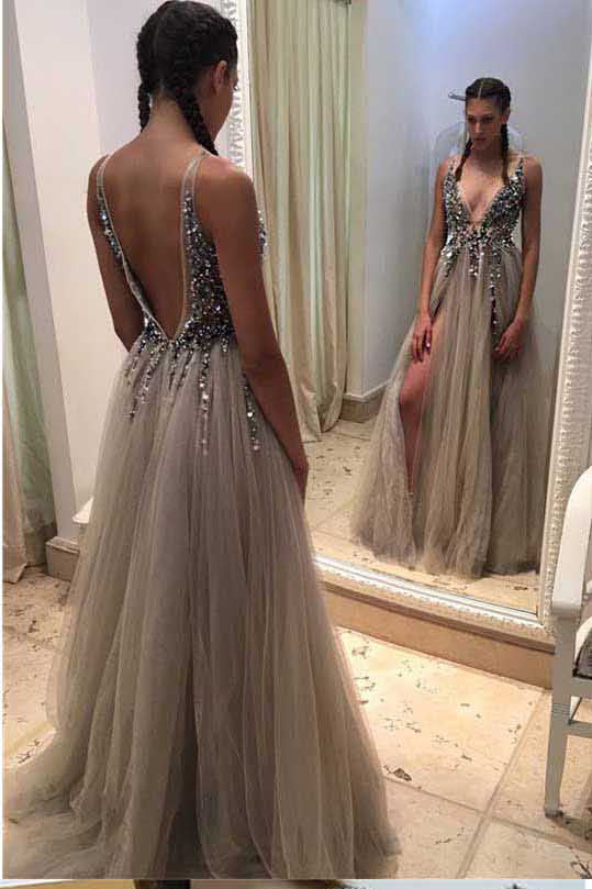 Sexy Deep V-neck Long A-line Tulle Backless Lace Prom Dress Women Dresses K769