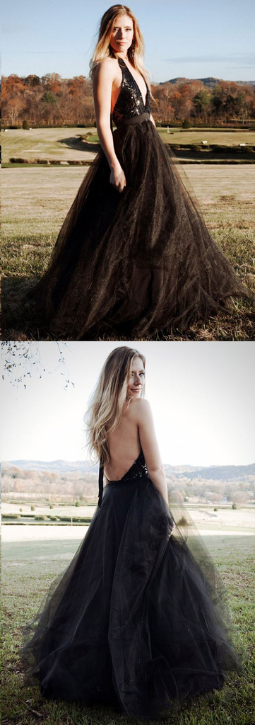 Black Tulle Backless Halter A Line Cheap Long Prom Dress Sexy Evening Dresses OKG27