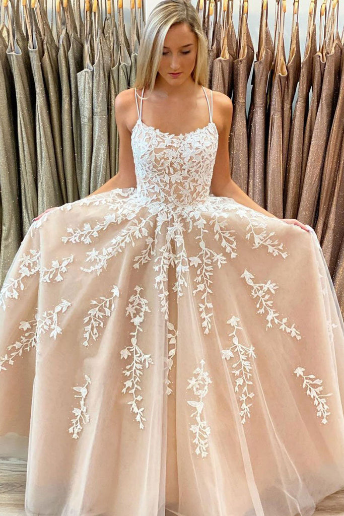 Elegant Spaghetti Straps A Line Tulle Long Lace Appliques Prom Dress OKZ22
