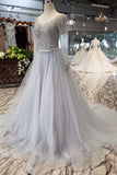 Long Sleeves V Neck Tulle A Line Sequins Prom Dress OKK10
