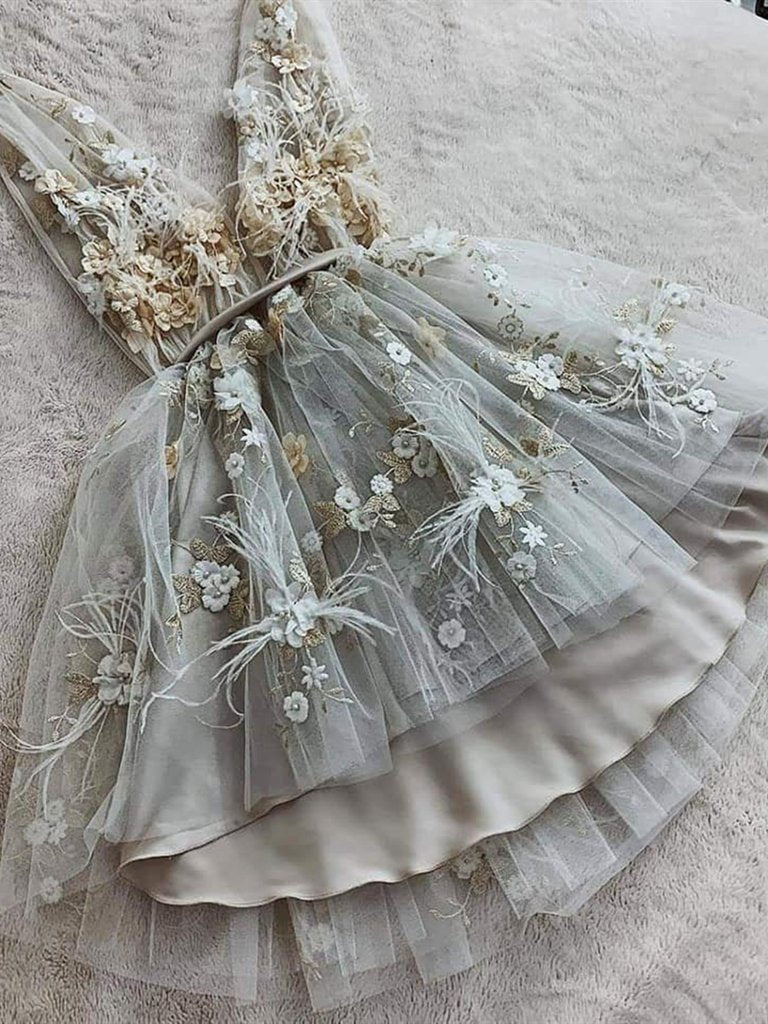 Cute V Neck Floral Short Gray Prom Dress Lace Formal Appliques Graduation Homecoming Dress OKX42