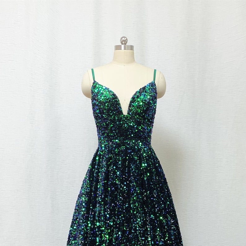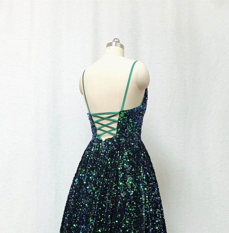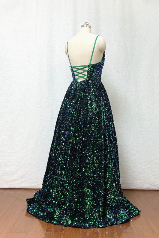 A-line Sequin Prom Dress Spaghetti Straps Forest Green Long Evening Dress OKW6