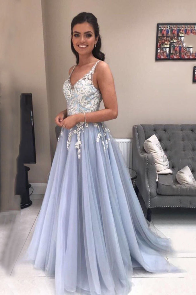 A Line Tulle Long Appliqued Prom Dress Spaghetti Straps Evening Dress OK1100
