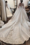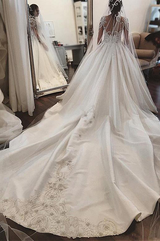 Attractive Satin Sheer Jewel Neckline Long Sleeves Wedding Dress With Lace Appliques OK869