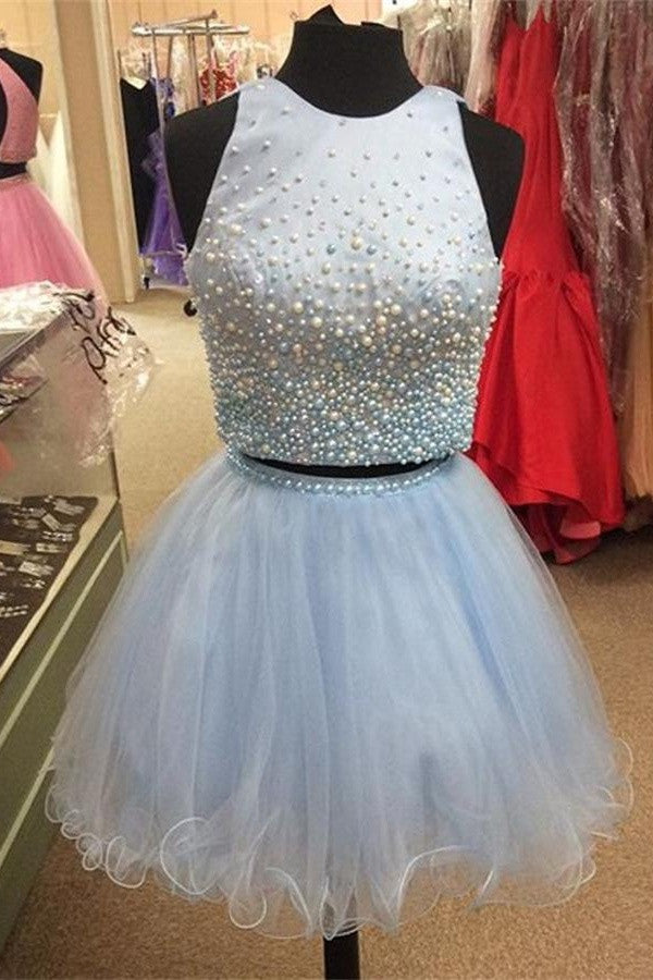 Baby Blue Tulle 2 Pieces Beading A-line O-neck Homecoming Dresses K454