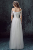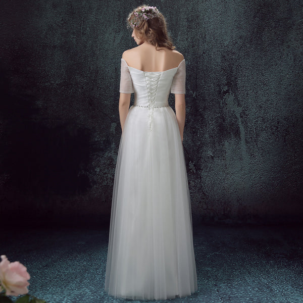 Simple Tulle Off Shoulder Floor-Length Short Sleeves A-line Lace Up Back Wedding Dresses OK802