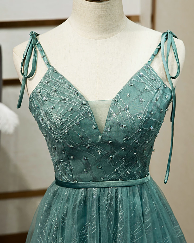 Spaghetti Straps Tulle Modest A Line Evening Dress Long Prom Dress OKR98